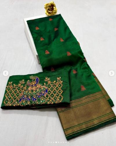 New Jhumka Paithani Collection : यात प्रामुख्यानं बॉटल ग्रीन, राणी गुलाबी, मोरपंखी, वांगी आणि जांभळ्या रंगांना अधिक पसंती दिली जात आहे.