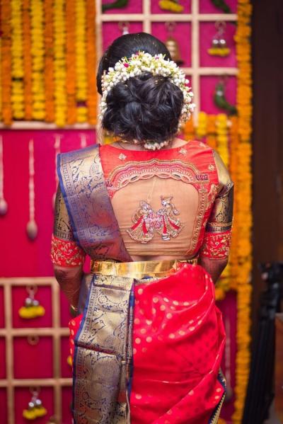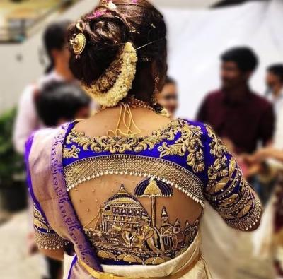 आपल्या पतीचे नाव लिहून नवरी असा शब्द प्रिंट करून घेऊ शकतात. आजकाल पतीचे नाव ब्लाऊजवर लिहायलची फॅशन बरीच ट्रेंडमध्ये आहे.
