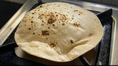 गॅसची आच मंद ते मध्यम ठेवा. वरची बाजू कोरडी होईपर्यंत भाजून घ्या. नंतर त्यावर लहान लहान बुडबुडे दिसून येतील. वरची बाजू पूर्ण कोरडी झाल्यानंतर चपाती हलक्या हातानं उलटवून घ्या.