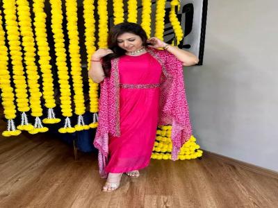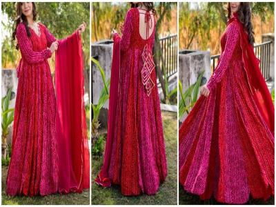 लाल, गुलाबी, पिंक अशा उठावदार बांधणीच्या साडीचा अनारकली ड्रेस अगदी सुंदर दिसतो. तुम्ही हा ड्रेस तुम्हाला हवा तितका घेरदार शिवू शकता.