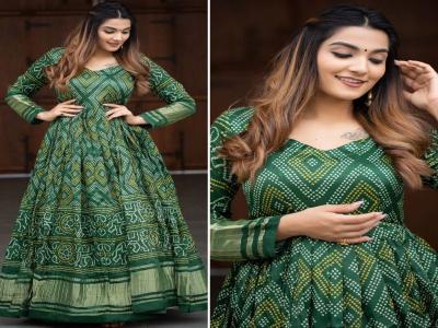 जर तुमच्याकडे एखादी बांधणीची साडी असेल तर तुम्ही त्यापासून असा लांब - घेरदार गाऊन शिवू शकता.