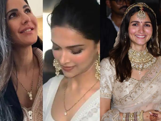 1 / 8आलिया भट आणि रणबीर कपूर यांचे नुकतेच लग्न झाले असून त्यांच्या लग्नसोहळ्यातील प्रत्येक गोष्टीची चर्चा रंगली. यामध्ये आलियाच्या आगळ्यावेगळ्या मंगळसूत्राचीही विशेष चर्चा झाली. या मंगळसूत्राला असलेल्या वेगळ्या आकाराच्या चिन्हाबाबत चाहत्यांमध्ये उत्सुकता असल्याचे पाहायला मिळाले. 2 / 8कैतरीनानेही नुकतेच विकी कौशल याच्याशी लग्न केले. तिच्या मंगळसूत्राला काळ्या आणि सोन्याच्या मण्यांमध्ये दोन छोटे हिरे जोड़ल्याने एक क्लासी आणि हटके लूक आला होता. कैतरिनाच्या गळ्यात हे नाजूक मंगळसूत्र अतिशय छान खुलून दिसत होते. या मंगळसूत्राची किंमत थोडीथोडकी नाही तर तब्बल ५ लाख रुपये असल्याचे बोलले जात आहे. 3 / 8सोनम कपूर तिच्या गर्भधारणेवरुन चांगलीच चर्चेत आहे. तिचे बेबी बंपचे बरेच फोटो गेल्या काही दिवसांत आपल्यासमोर आले आहेत. २०१८ मध्ये आनंद आहुजाशी लग्न झालेल्या सोनमच्या मंगळसूत्राची किंमत ५५ लाख आहे. काळ्या मण्यांमध्ये मध्यभागी एक डायमंड असलेल्या या मंगळसूत्राला या दोघांच्या राशींची चिन्हे जोडण्यात आली आहेत. त्यामुळे या मंगळसूत्राचा लूक एकदम बदलला आहे. 4 / 8प्रियांका चोप्राने निक जोनास याच्याशी लग्न केले असून तिचे मंगळसूत्रही सब्यासाचीने डिझाईन केलेले होते. या मंगळसूत्राची किंमत कोटीमध्ये असल्याचे बोलले जात आहे. तीन लहान खडे आणि खाली एक मोठा लोलक अशी या मंगळसूत्राची डिझाईन होती. 5 / 8दिपिका आणि रणवीर सिंग यांच्या लग्नाची बॉलिवूडमध्ये आणि चाहत्यांमध्ये खूप चर्चा झाली होती. दिपिकाचे मंगळसूत्र पाहायला अतिशय साधे आणि नाजूक वाटत असले तरी त्याची किंमत २० लाख रुपये आहे. दिपिका विविध पारंपरिक कार्यक्रमांत हे मंगळसूत्र घातलेली पाहायला मिळते. 6 / 8प्रसिद्ध अभिनेता राजकुमार राव याने अभिनेत्री पत्रलेखासोबत लग्न केले. त्यानंतर या दोघांचे विमानतळावरील फोटो व्हायरल झाले होते. लाल रंगाच्या साडीमध्ये पत्रलेखाने घातलेले मंगळसूत्र त्यावेळी चर्चेचा विषय ठरले होते. सब्यासाचीने डिझाईन केलेल्या या मंगळसूत्राची जोरदार चर्चा रंगली होती. यामध्ये वाघाचे चिन्ह असून ते ऑक्सिडाईजमध्ये असल्याचे पाहायला मिळते. 7 / 8अनुष्का शर्मा हिने क्रिकेटपटू विराट कोहली याच्याशी लग्नगाठ बांधली. काळ्या मण्यांचे दोन पदर असलेल्या या मंगळसूत्राला खाली मोठे डायमंड पेंडंट आहे. तिच्या गळ्यात हे पेंडंट चमकताना दिसते. विराटने अतिशय प्रेमाने घातलेल्या या मंगळसूत्राची किंमत ५२ लाख रुपये इतकी आहे.8 / 8आपल्यापैकी अनेकांची आवडती अभिनेत्री असलेल्या ऐश्वर्याने अभिनेता अभिषेक बच्चन याच्याशी लग्न केले. त्यावेळी तिच्या मंगळसूत्राबाबतही बरीच चर्चा झाली होती. दोन पदरी काळे मणी असलेल्या या मंगळसूत्राल