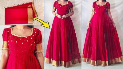 काठपदराच्या किंवा सिल्क साडीचा घोळदार अनारकली ड्रेस अत्यंत रॉयल दिसतो. साडीच्या पदराचा वापर तुम्ही ड्रेसच्या किंवा ओढणीच्या काठांवर मस्त बॉर्डर लावून तो अधिक आकर्षक करू शकता. साडीच्या मोठ्या लांबीमुळे अनारकलीला भरपूर घेर मिळतो. साडीचे जड काठ खालच्या बाजूला लावल्यामुळे ड्रेसला एक महागडा लूक येतो. साडीच्या पदराचा उपयोग ड्रेसच्या वरील भागासाठी करा, ज्यामुळे समोरून तो अतिशय डिझायनर वाटेल.