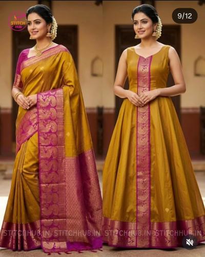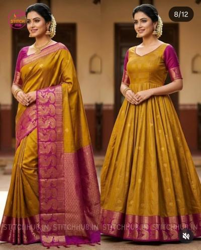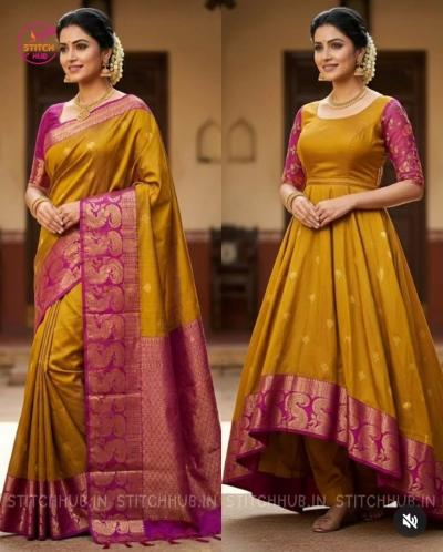 जर तुम्हाला जास्त हेवी ड्रेस नको असेल आणि काहीतरी हलकं-फुलकं पण ट्रेंडी हवं असेल, तर साडीपासून बनवलेला 'फ्रॉक स्टाईल ड्रेस' एक उत्तम चॉईस आहे. हा ड्रेस दिसायला वेस्टर्न असला तरी साडीच्या फॅब्रिकमुळे त्याला एक वेगळाच 'एथनिक टच' मिळतो. हलका, फ्लोई आणि फेमिनिन लूक देणारा फ्रॉक साडीच्या कापडातून सहज तयार होतो. असा हा फ्रॉक स्टाइल ड्रेस आपण एखाद्या खास प्रसंगी किंवा घरातील लग्नकार्य, हळद, मेहेंदी, सणावाराला घालू शकता. साडीच्या कापडापासून गुडघ्यापर्यंत लांबीचा किंवा त्यापेक्षा जास्त लांबीचा असणारा फ्रॉक शिवता येतो. यामध्ये तुम्ही 'ए-लाईन' किंवा 'फ्लेअर्ड' असे दोन्ही प्रकार ट्राय करू शकता. कंबरेपाशी छोटी प्लेट्स किंवा 'गॅदर्स' देऊन खालचा घेर वाढवता येतो. साडीची बॉर्डर ड्रेसच्या खालच्या बाजूला किंवा हाताच्या टोकाला लावल्यास तो अधिक उठून दिसतो. हा पॅटर्न तरुणींपासून ते लहान मुलींपर्यंत सर्वांनाच खूप सुंदर दिसतो.