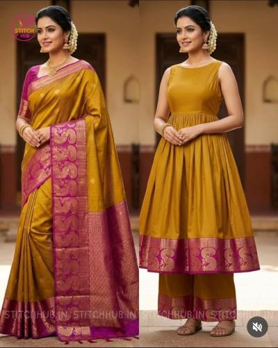 साडीच्या प्लेन भागाचा वापर करून 'स्ट्रेट कट' कुर्ता शिवा आणि साडीच्या ठळक काठांचा वापर कुर्तीच्या खालच्या घेऱ्यावर, गळ्यावर आणि हाताच्या बाह्यांवर करा. यामुळे कुर्तीला एक अतिशय फॉर्मल आणि रिच लूक मिळतो. उरलेल्या साडीच्या कापडापासून घेरदार प्लाझो शिवता येतो. जर साडीला दोन्ही बाजूंनी बॉर्डर असेल, तर ती बॉर्डर प्लाझोच्या खालच्या बाजूला लावल्यास तो एखाद्या डिझायनर पॅन्टसारखा दिसतो. या सूटसोबत दुपट्टा घेण्याची गरज नाही, पण जर तुम्हाला हवा असेल तर साडीच्या उरलेल्या नेट किंवा शिफॉनच्या भागाचा एक छोटा स्टोल बनवू शकता. हा ड्रेस ऑफिस मीटिंग्सपासून ते सणासुदीपर्यंत सगळ्या प्रसंगी उठून दिसेल.