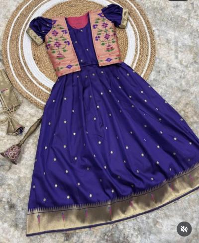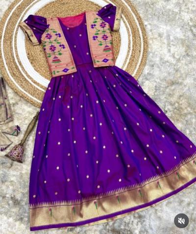 पैठणीचा तोच नक्षीदार पदर, मोर-पोपटाची सुंदर वीण आणि भरजरी बॉर्डर आता गाऊनच्या स्वरूपात उपलब्ध आहे. विशेष म्हणजे त्यावरचे मॅचिंग जॅकेट या ट्रेंडी लूकला एक 'रॉयल' टच देते. यंदाच्या वेडिंग सीजनमध्ये तुमच्या चिमुकलीला एखाद्या परीसारखं सजवण्यासाठी हे इंडो-वेस्टर्न पैठणी डिझाईन्स नक्कीच ट्राय करायला हवेत.