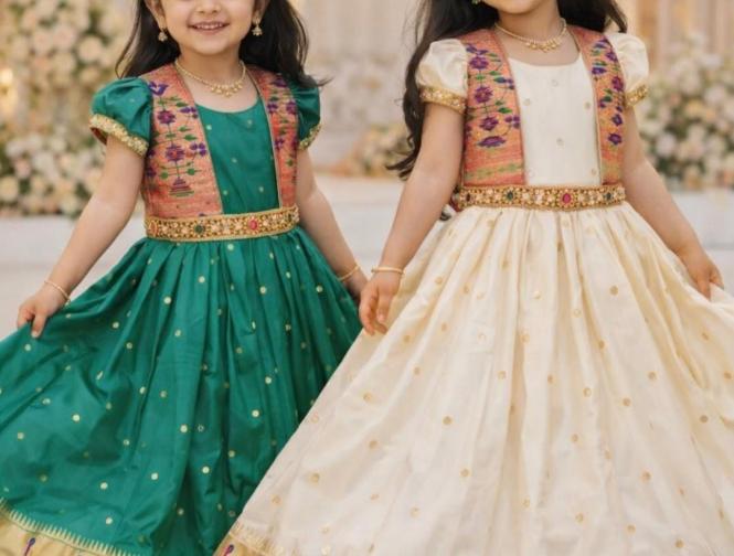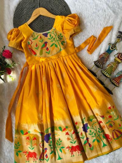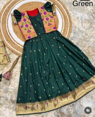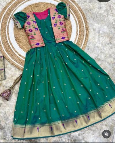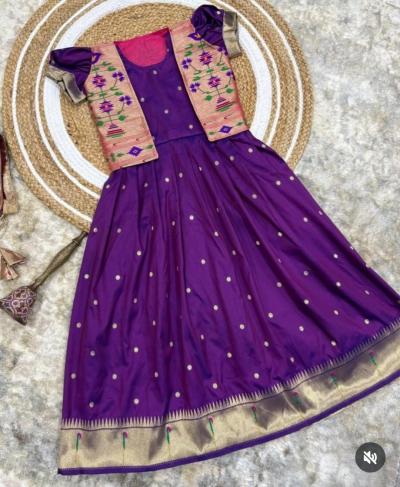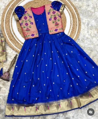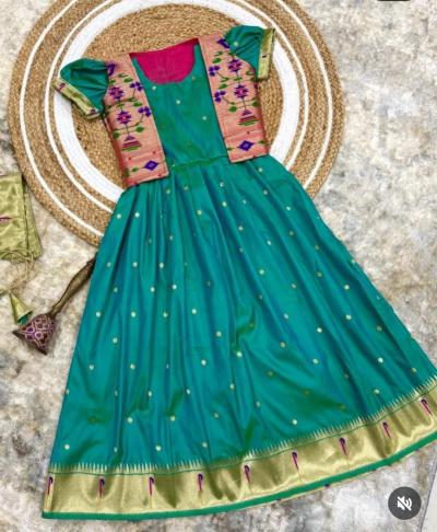 पैठणीचा झगमगता काठ, मोर-फुलांच्या नक्षी आणि रेशमी टेक्स्चरमुळे ( baby girl wedding outfit traditional) हा गाऊन प्रत्येक खास प्रसंगी उठून दिसतो. त्यावर मॅचिंग किंवा कॉन्ट्रास्ट जॅकेट घातल्याने लुक अधिक आकर्षक आणि स्टायलिश दिसतो. लहान मुलींसाठी हे डिझाईन्स उत्तम पर्याय ठरतात.