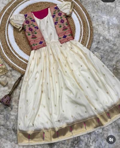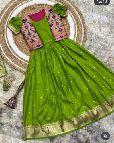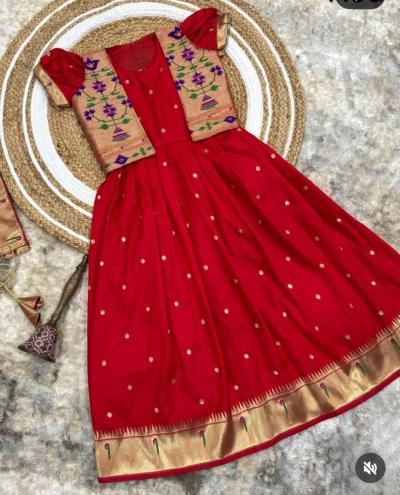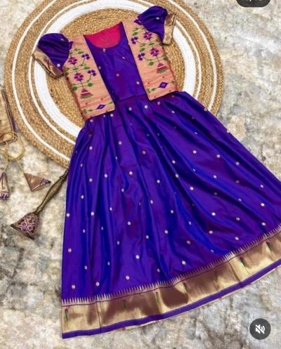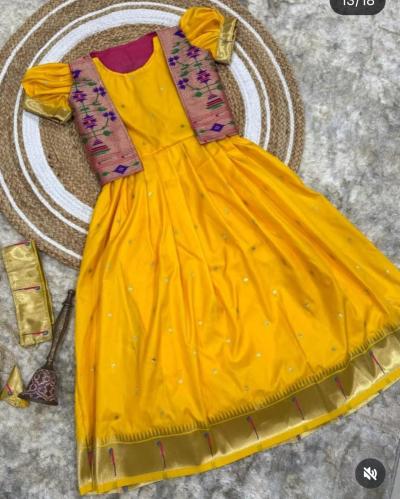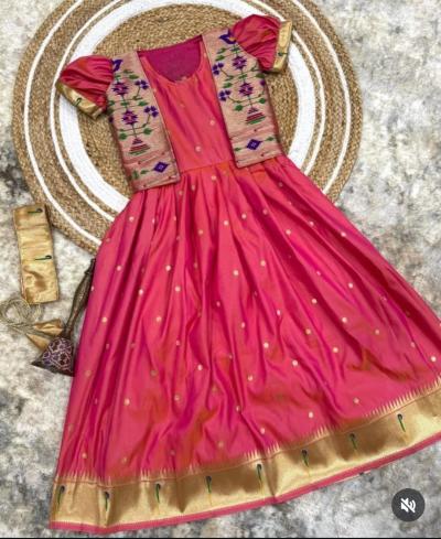 तुमच्याकडे एखादी जुनी पैठणी साडी असेल, जी तुम्ही आता नेसत नाही, तर त्यातून लेकीचा हा ड्रेस शिवता येईल. साडीच्या प्लेन भागाचा वापर गाऊनच्या घेरासाठी करा.साडीच्या भरजरी पदराचा वापर जॅकेट बनवण्यासाठी करा.