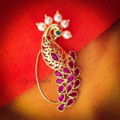 मोराच्या डिझाईनमध्ये हल्ली खूप वेगवेगळ्या नथ मिळत आहेत.