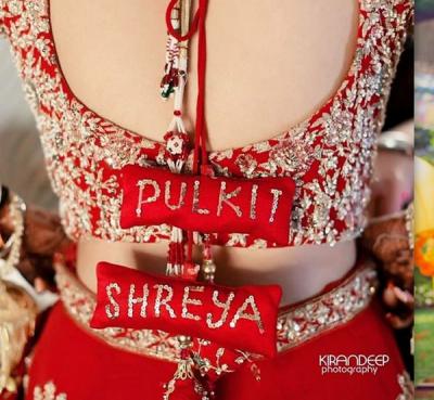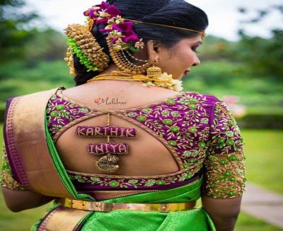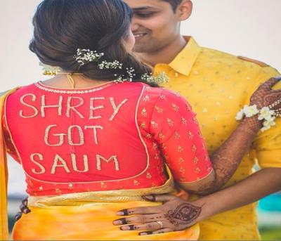 जर ब्लाऊजच्या मागच्या गळ्यावर काही लिहायला आवडत नसेल तर नवरा- नवरीच्या नावाचे लटकन बनवून ते ही मागच्या बाजुने लावता येईल.