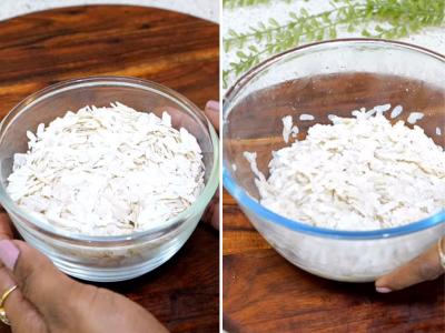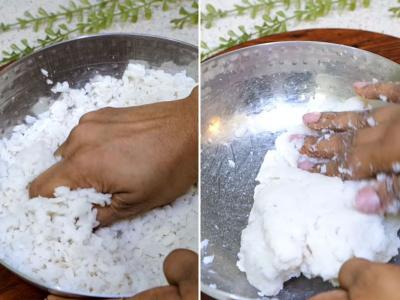 २) पोह्यांचे पाणी पूर्ण निघाल्यानंतर ते एका ताटात काढून घ्या. भिजवलेले पोहे हातानं मॅश करून घ्या. तांदळाच्या पीठाप्रमाणे पोह्यांचा गोळा मळून घ्या.