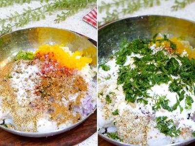 ३) त्यात उकडलेल्या बटाट्यांचा किस, बारीक चिरलेला कांदा, बारीक कापलेली शिमला मिरची, आलं लसूण पेस्ट, लाल तिखट, जीरं पावडर, धणे पावडर, गरम मसाला, चाट मसाला, चवीनुसार मीठ घाला.