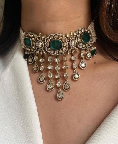 चोकर स्टाइल पोल्की नेकलेस सध्या खूप ट्रेंडमध्ये आहे. हा नेकलेस साडी, गाऊन किंवा लेहेंग्यासोबत खूप स्टायलिश दिसतो. गळ्याला चिटकून बसणारे हे चोकर डीप नेक ब्लाऊजवर अप्रतिम दिसतात. यामध्ये कुंदन आणि मोत्यांचे कॉम्बिनेशन जास्त उठून दिसते.