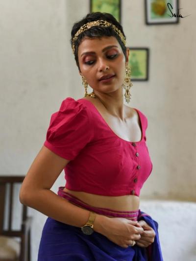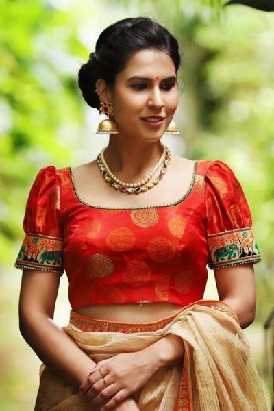 यू-नेक हाफ स्लीव्ह पफ ब्लाउज देखील सिम्प्ल साड्यांवर शोभून दिसेल.