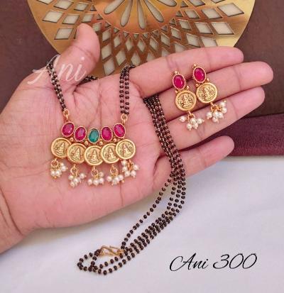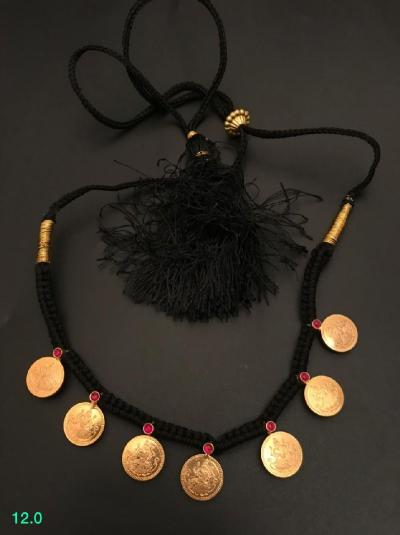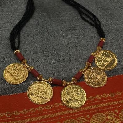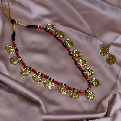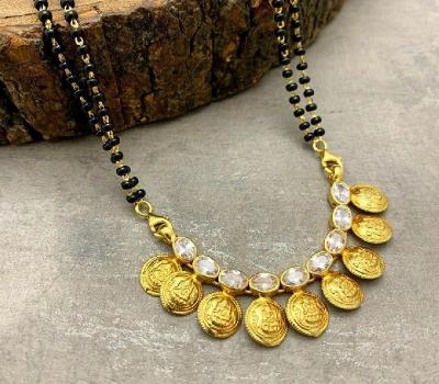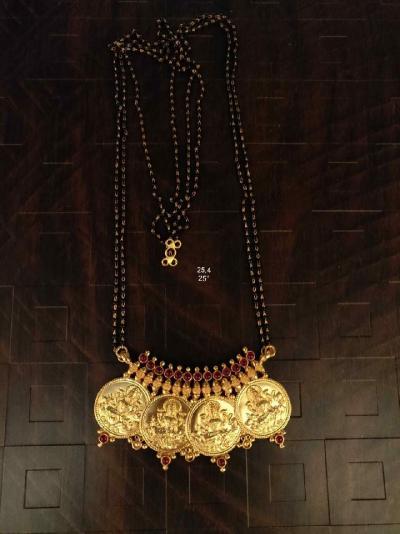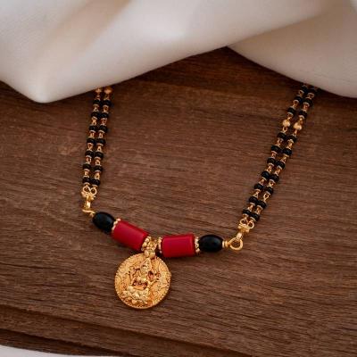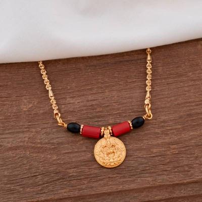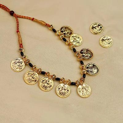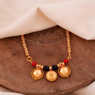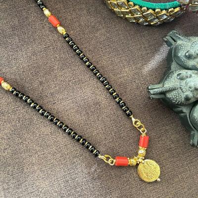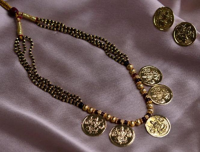 पारंपरिक गोल कॉईनमध्ये कोरलेली लक्ष्मीची प्रतिमा आणि काळ्या मण्यांची साधी बारीकशी सर अशा नाजूक व सुंदर डिझाईनचे मंगळसूत्र रोजच्या वापरासाठीही योग्य.
