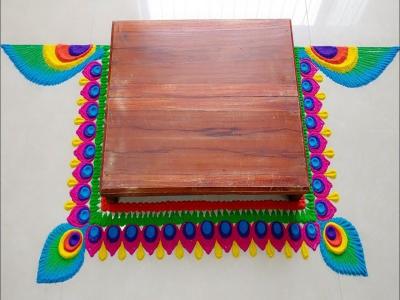 रांगोळीच्या विविध रंगांचा वापर करून देखील आपण ही सुंदर व काढायला सोपी अशी मोर पंखी रांगोळीची डिझाईन काढू शकता. यातील विविध रंगांच्या रंगसंगतीमुळे ही रांगोळी अधिकच उठून दिसते.