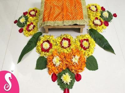 पाटाभोवती आपण रांगोळी म्हणून पानाफुलांचा देखील वापर करु शकता. वेगवेगळ्या फुलांच्या पाकळ्या व विविध आकारांच्या पानाने देखील सुबक अशी सजावट अगदी झटपट करता येते.