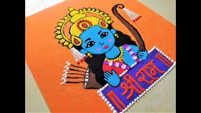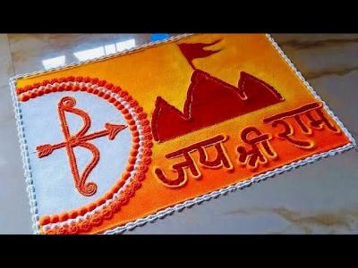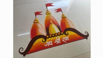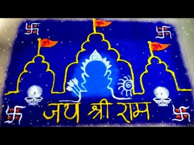 साधं मंदीर काढून त्यात श्री राम असं रांगोळीने लिहू शकता. तरीही शोभून दिले. या रांगोळी साठी तुम्ही पिवळ्या किवा नारंगी रंगाचा वापर केला तर अधिकच उठून दिसेल.