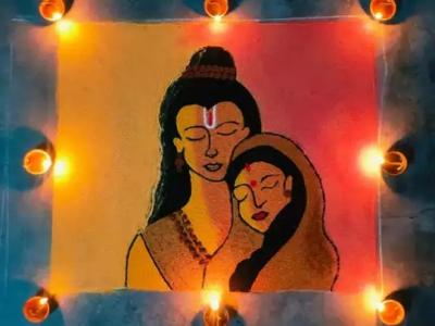 देव्हाऱ्याजवळ किंवा दारासमोर तुम्ही अशी रांगोळी काढू शकता ज्यात माता सिता आणि लक्ष्ण रामासह एकत्र दिसत असतील. या फोटोतील रांगोळीच्या डिजाईन्सच्या रांगोळीप्रमाणे सोपी रांगोळी तुम्ही काढू शकता.