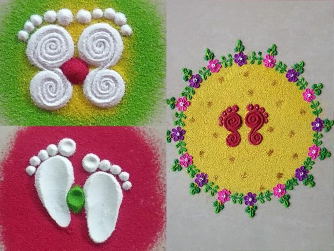 1 / 9गणरायाचे आगमन झाल्यानंतर त्याच्या पाठोपाठच महालक्ष्मीचेही आगमन होते. काही ठिकाणी त्यांना गौरी, ज्येष्ठागौरी असंही म्हणतात. गौरी- गणपतीचा हा सण मोठाचा उत्साहाचा, आनंदाचा असतो.2 / 9महालक्ष्मी किंवा गौरीच्या सणात आपण दारापुढे मोठी रांगोळी तर काढतोच. पण त्याबरोबरच गौरीची नाजूक पाऊलंही घरभर आणि घराच्या मुख्य द्वारापाशी काढली जातात. 3 / 9ती पाऊलं सुबक पद्धतीने कशी काढायची याच्या काही आयडिया पाहिजे असतील तर त्यासाठी या काही छान डिझाईन्स पाहा.4 / 9सगळ्यात सोपी ही एक पद्धत पाहा. अशा प्रकारची पाऊले अगदी झटपट काढून होतील.5 / 9वर सांगितलेल्या पाऊलांमध्ये हळदीचा आणि कुंकवाचा वापर करून तुम्ही अशा पद्धतीने त्यांना अधिक ठसठशीत करू शकता.6 / 9गौरीची पाऊलं काढण्याची ही आणखी एक सोपी पद्धत बघा. वर मोठा ठिपका आणि खाली छोटा ठिपका. तसेच बोटांचे पाच छोटे- छोटे ठिपके. एवढेच काढले तरी अशी सुरेख पाऊलं तयार होतात. 7 / 9अशा पद्धतीचा पाऊलांचा आकारही खूप आकर्षक वाटतो. अगदी खरं पाऊल ठेवलं आहे, अशा पद्धतीचा भास ही पाऊलं पाहून होतो. 8 / 9गौरीच्या मखरासमोर किंवा घराच्या मुख्य द्वारासमोर रांगोळी काढायची असेल तर अशा पद्धतीची सुंदर रांगोळी तुम्ही काढू शकता.9 / 9घराच्या मुख्य दारापाशी जर गौरीच्या सणादरम्यान रांगोळी काढायची असेल तर हे एक डिझाईन अतिशय सुंदर दिसेल.