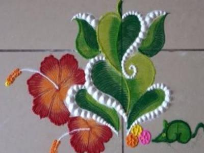 जास्वंदाची फुलं आणि पानं यांच्या रुपातील गणपती बाप्पा काढायला थोडा किचकट वाटू शकतो. पण ही रांगोळी पूर्ण झाल्यावर अतिशय सुंदर दिसते.