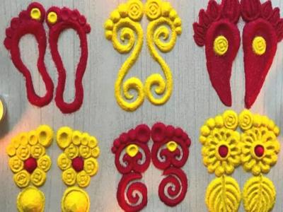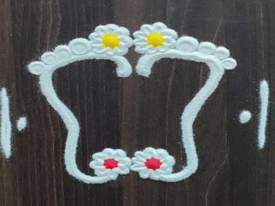 विविध प्रकारे पाऊलांचे आकार काढता येतात. पिवळा पांढरा लाल रंग वापरता येतो. अगदी मस्त दिसेल आणि काढायला एकदम सोपी आहे.