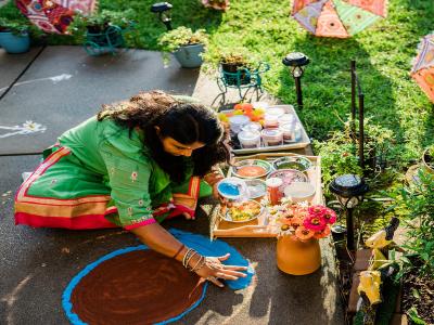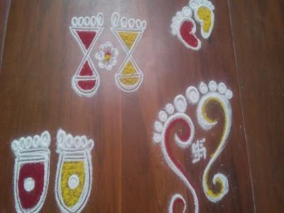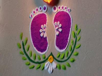 पाऊले काढून त्यात एखादा रंग भरायचा. असेही छान दिसते आणि घराच्या सगळ्या दारांसमोर काढता येते.