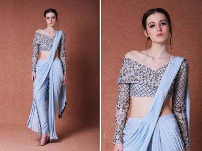 पारंपरिक साडी आणि वेस्टर्न पँटचा फ्युजन असलेली ही स्टाईल तरुणींमध्ये खूप लोकप्रिय आहे.