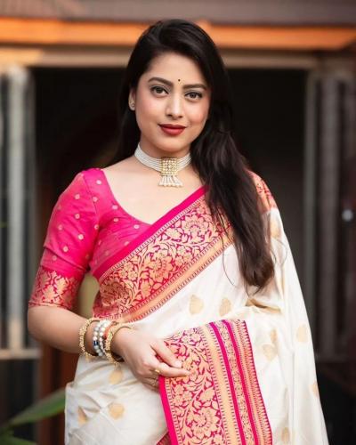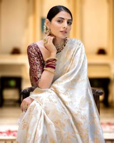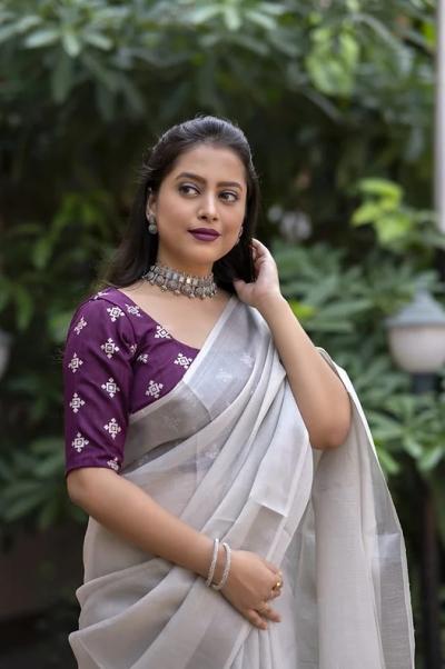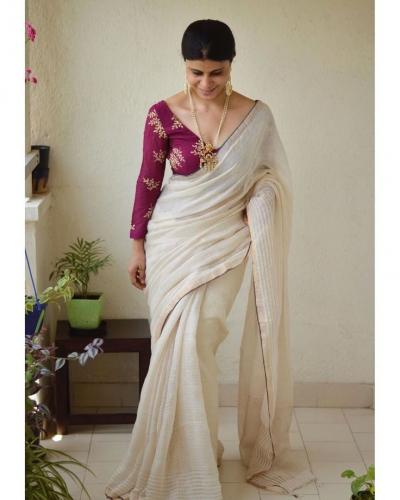 पांढऱ्या रंगाची साडी पर्पल रंगाच्या ब्लाऊजवर चांगली दिसते.
