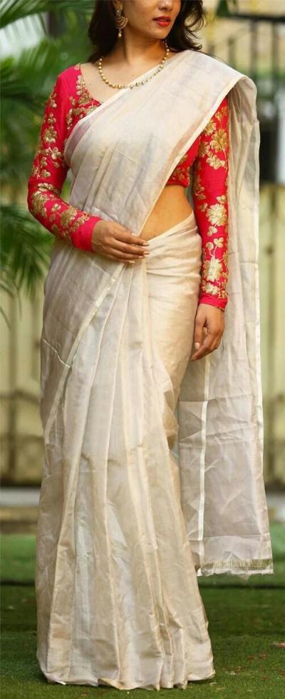 स्लिव्हजलेस किंवा लॉन्ग हॅण्ड्संच ब्लाऊज पांढऱ्या साडीवर सुंदर दिसेल.