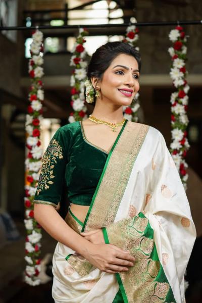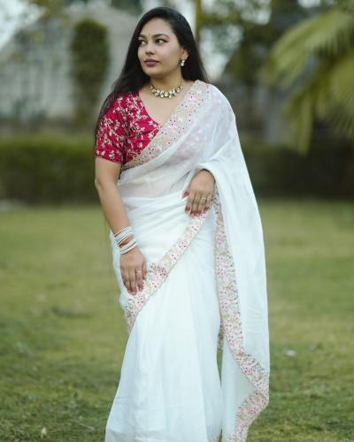 यातील सर्व रंग पांढऱ्या तसंच मोती रंगाच्या साडीवर उठून दिसतील. तुम्ही कोणत्याही प्रकारे साडी स्टायलिंग करू शकता.