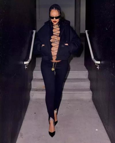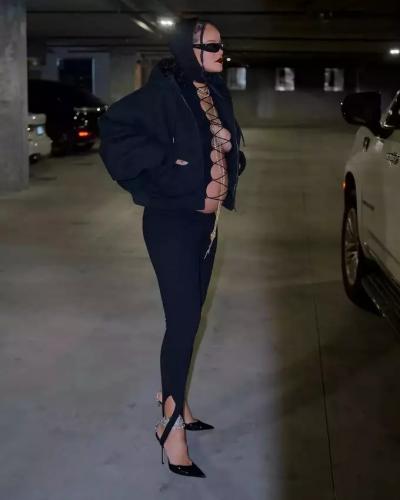 या लूकमध्ये रिहानाने पहिल्यांदा तिचा बेबी बंप सर्वांसमोर दाखवले. यावेळी तिने गुलाबी रंगाचे जाकीट घातले होते, ज्याची बटणे पोटाच्या भागानंतर उघडी ठेवली होती.