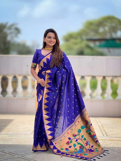 ब्लू पैठणी साडी हा लग्नसराईसाठी एक अतिशय आकर्षक आणि शाही पैठणीचा पर्याय आहे. जो अधुनिकता आणि पारंपारीकतेचा संगम साधते. (10 Patterns In Blue Color Paithani)
