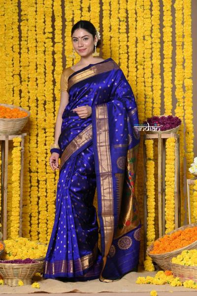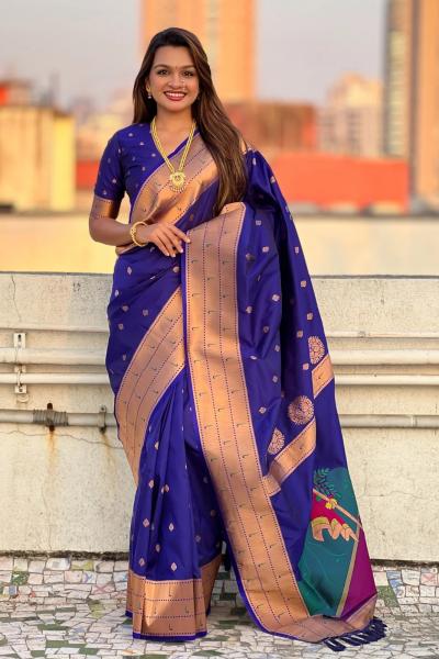 Royal Blue Paithani Saree For Wedding : मठ्ठा पैठणी किंवा सेमी पैठणीतही हा रंग उठून दिसतो. सेमी पैठणीत रेशिम मिश्रित पर्याय उपलब्ध आहे.