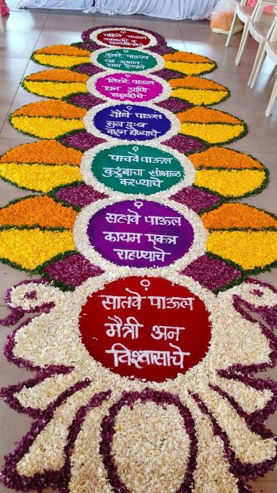 तांदूळ आणि फुलांपासून बनवलेले सप्तपदीचे डेकोरेशन हे दिसायला छान असते. यामध्ये आपण सप्तपदीच्या सात वचनांचा अर्थ देखील लिहू शकतो.