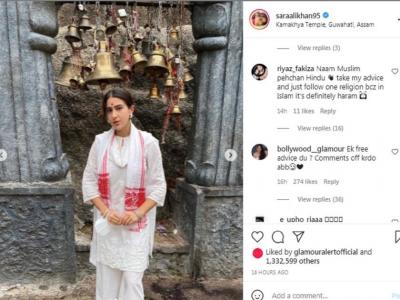 तिथले काही फोटो साराने तिच्या इन्स्टाग्राम अकाऊंटवर शेअर केले. त्यानंतर साराला सोशल मीडियावर तिच्या धर्मावरून ट्रोल करण्यात आले. तुम्ही पाहू शकता या फोटोमध्ये सारा पांढ-या रंगाच्या सलवार सूटमध्ये आहे. गळ्यात आसामचा पारंपरिक स्कार्फ आहे. माथ्यावर टिळा लावला आहे.