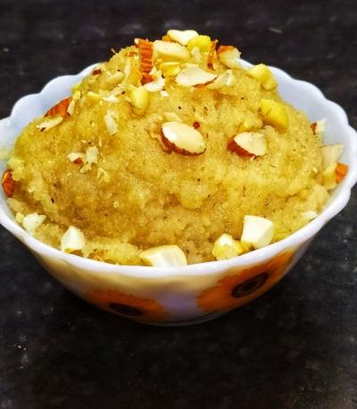 शिरा तयार झाल्यावर शेवटी वरून थोडं साजूक तूप सोडल्यानं त्याला छान चकाकी येते आणि चव वाढते.