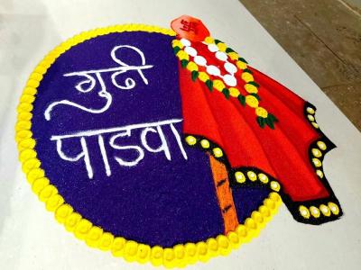 शुभ गुढीपाडवा असा संदेश रांगोळीवर लिहून देखील तुम्ही ही रांगोळी अधिक आकर्षक करु शकता.