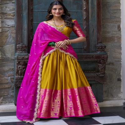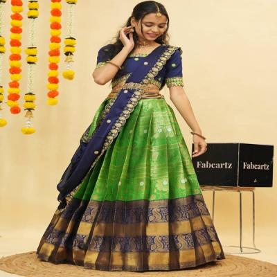 साऊथ इंडियन घागऱ्याचा हा एक आणखी सुंदर आणि आकर्षक प्रकार पाहा. फ्रेश रंग, मोठे काठ आणि सुंदर ओढण्या यामुळे हा घागरा अंगावर उठूनच दिसतो.