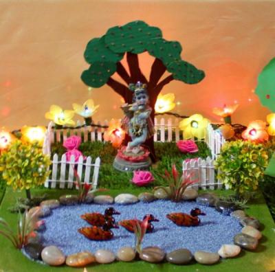 हा एक साधा- सोपा देखावा.. जाड कागद वापरून तयार केलेलं झाड आणि त्याभोवती आर्टिफिशीयल ग्रास आणि शोभेची झाडं वापरून केलेला देखावा.. पाण्याचा सीन करायचा असल्यास खाली आरसा ठेवून त्याभोवती असे दगड, शोभेची झाडंही ठेवू शकता.