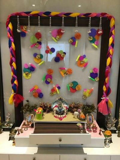 हा एक झटपट होणारा साधा- सुटसुटीत देखावा. अशा पद्धतीची चौकट घरी उपलब्ध असेल तर तो सहजपणे करता येईल. फोटोमध्ये जे लटकवलेलं दिसत आहे, तेच लटकविण्याची गरज नाही. तुम्ही त्याऐवजी छोटे दिवे, फुलं, मणी असं काहीही वापरू शकता.