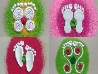 फक्त पांढरीच नाही तर इतर रंगांचा देखील वापर करून आपण पाऊलांची रांगोळी झटपट काढू शकतो.