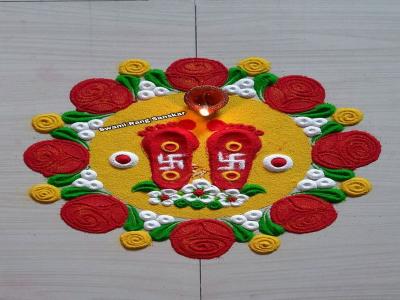 पाऊलांच्या रांगोळीभोवती आपण दिवे लावून देखील सुंदर व नाजूक अशी सजावट करु शकतो. यामुळे रांगोळी नेहमीपेक्षा अधिक जास्त खुलून दिसेल.