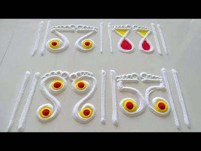 पाऊलांची रांगोळी काढताना आपण सर्वातआधी पांढऱ्या रांगोळीने पाऊले काढून मग त्यात हळद, कुंकू भरुन अशा प्रकारची रेखीव व सुंदर रांगोळी काढू शकतो.