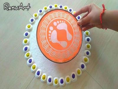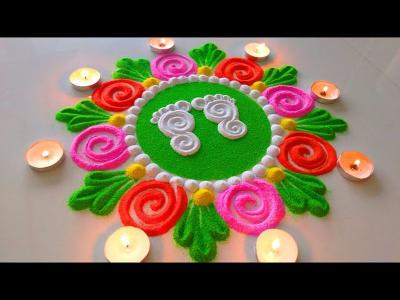 रांगोळी काढण्यासाठी फार मोठा घाट न घालता, आपण अगदी कमी वेळात देवीच्या पाऊलांची अशी सुंदर व तितकीच रेखीव अशी रांगोळी पटकन काढू शकतो.