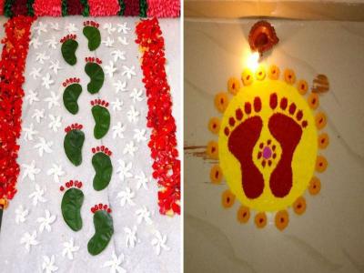 आपण फक्त देवीच्या पाऊलांची रांगोळी न काढता, पाऊलांभोवती पाने, फुले किंवा इतर डिझाईन्स काढून रांगोळी अधिक रेखीव व सुंदर करु शकतो.