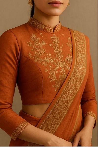 स्टँड कॉलर विथ की-होल ब्लाऊजमध्ये कॉलर स्टँड असते, पण गळ्याच्या खाली छोटासा होल किंवा कट असतो. यामुळे लूक जास्त बंदिस्त वाटत नाही आणि गळ्यात छोटा हार देखील घालता येतो.