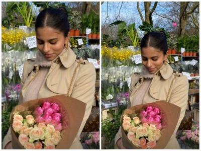 सुहाना या फोटोमध्ये सोज्वळ आणि सुंदर दिसत आहे. तिच्या हातात फुलांचा पुष्पगुच्छ देखील दिसत आहे.