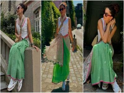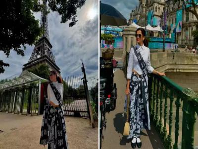 तापसीचा हा लूक खूपच हटके आहे. ज्यामध्ये तिने पांढऱ्या क्रॉप शर्टसह काळ्या आणि पांढऱ्या रंगाची प्रिंटेड साडी नेसली आहे. तिचा शर्ट तळाशी कट असणारा आहे त्याचबरोबर शर्टाची बाही दुमडलेली आहे आणि सर्व बटणे बंद ठेवली आहेत. त्याच वेळी, तिने काळे शूज आणि पांढरे मोजे घातले आहेत. हे पाहून तुम्हालाही तुमचे शाळेचे दिवस आठवतील.