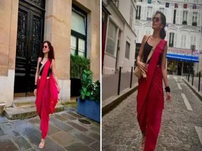 तापसीने काळ्या रंगांच्या टॉपवर लाल रंगाची धोती स्टाईल साडी नेसली आहे. काळे पोलका डॉट्स असलेली गुलाबी मुल्मुल कॉटनची साडी नेसली आहे.
